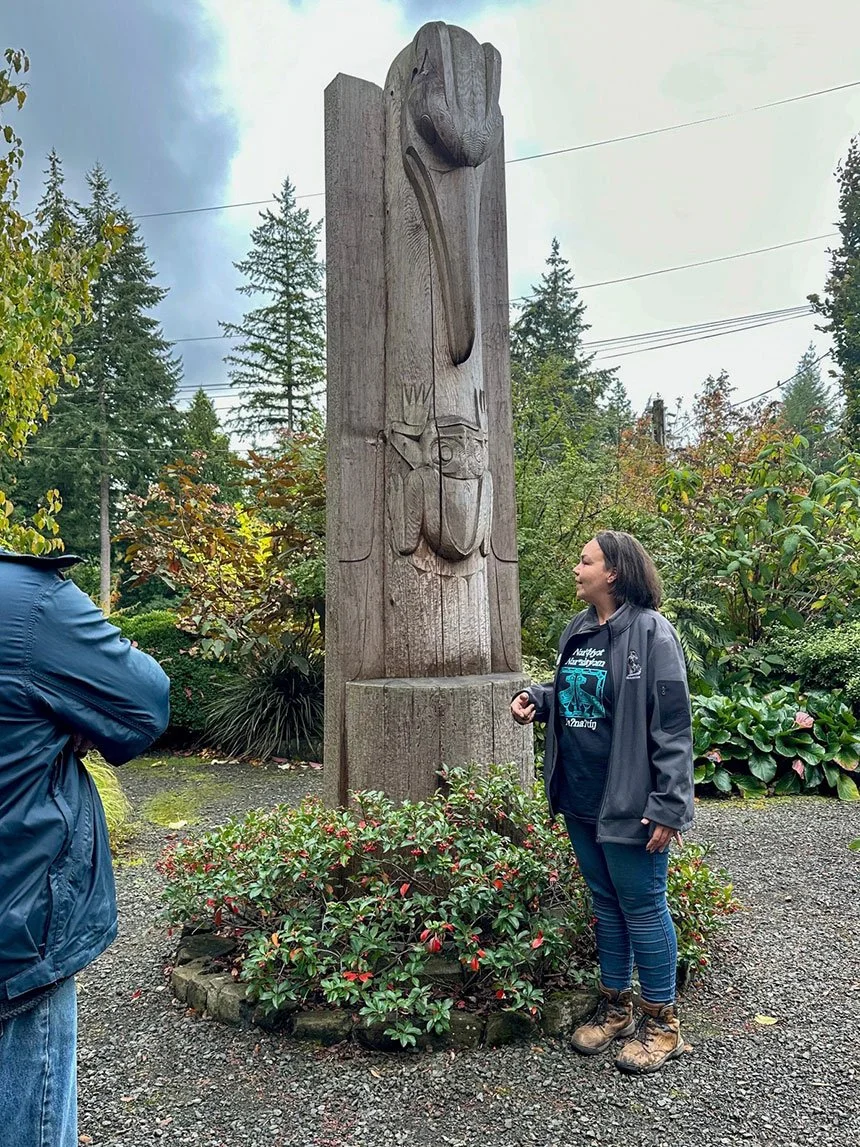 Debby Purser, Heronswood Volunteer Coordinator and S’Klallam tribal member describing the welcome pole recently installed at the new entry to the garden. Photo: Tom Lawson