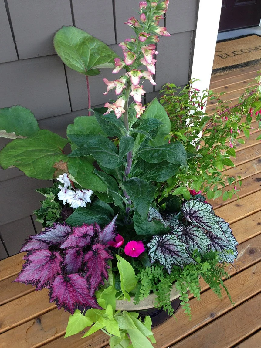 Brilliantly colored foliage pops in part shade. Plantings include Digiplexis, fuchsia, begonias, and sweet potato vine. Design by Kristy Law; photo courtesy of Richard Law