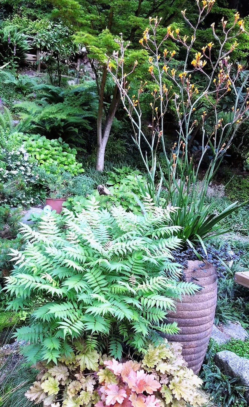 Plantings in a pair of rustic Vietnamese pots at the corner of a patio include ‘Kanga Yellow’ kangaroo paws with Sedum pluricaule 'Isle of Sakhalin', Sorbaria sorbifolia ‘Sem’, and heucheras. Photo and design by North Beach Landscapes