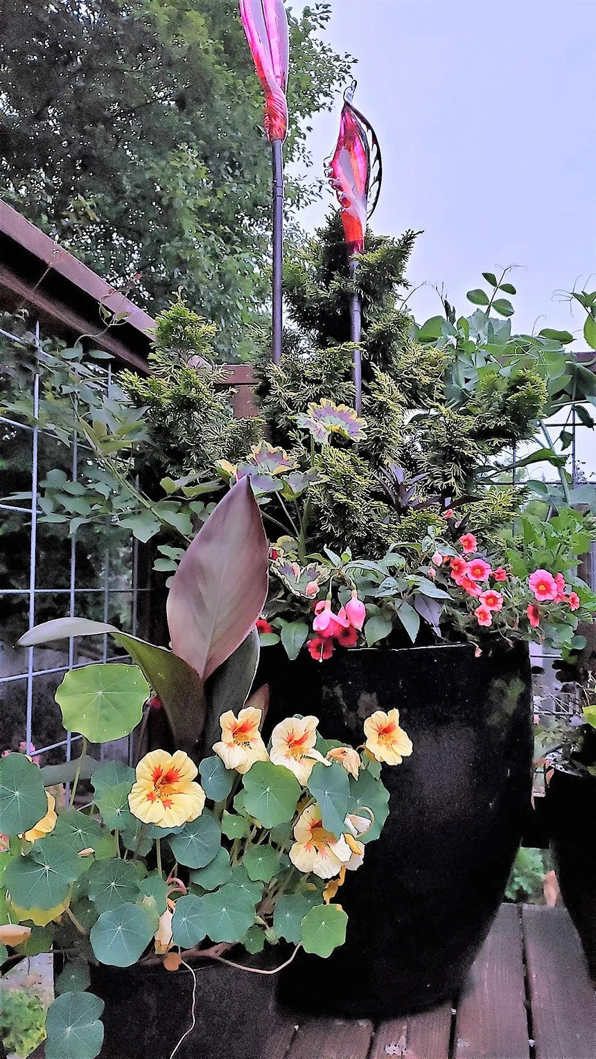 Glass art spires rise above plants in this cluster of containers, which include Chamaecyparis ‘Nana lutea’, Canna ‘Dark Knight’, nasturtium, zonal geranium ‘Mrs. Pollock’, and pink calibrachoa. Design and photo by Kryssie Maybay