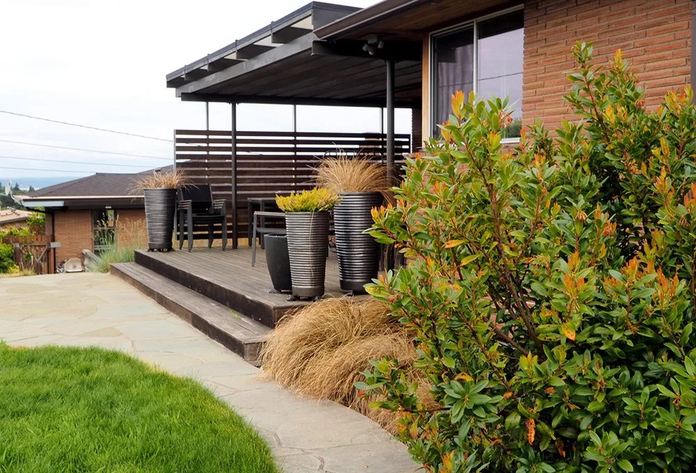 The mid-century home in North Seattle has beautiful views of Puget Sound and the Olympics, but only in the front yard. The existing garden on the property was an outdated and overgrown collection of plants and lawn. My program for the front of house was to provide a venue for enjoying the view, including privacy from the street, while creating a plant palette with year-round interest and minimal maintenance. Removing the lawn in front was all required. In addition, I was asked to bring the design around the small side garden and into the back, where a new deck and home update had recently been completed. The rest of the back of house was to remain mostly lawn and a play structure for the family’s young children.