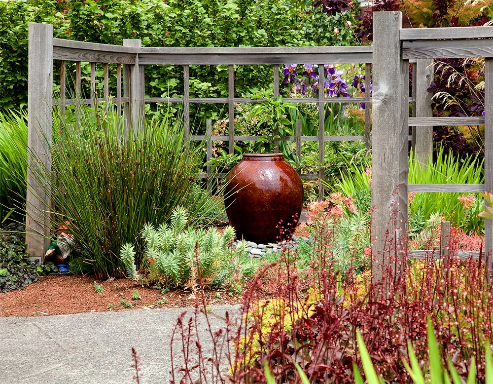 The resulting design is one that invites the family and guests outside. A patio of overlapping circles, with built-in seating (that doubles as a retaining wall) and a gas fire provide the focus. The plantings, including variegated red-twig dogwood, oak-leaf hydrangea, yews and strawberry trees, serve to provide privacy from the sidewalk and street while softening the patio edges; all without restricting the spectacular territorial view. Imagine watching the sun set as you sip wine around the fire! The same stone used in the patio field continues down the narrow side garden, where small plantings of conifers and grasses provide the border between neighbors. In the back, the stone again becomes a patio, this time as a landing off the deck and into the lawn where the kids can play. From the patio, the pathway leads to another circle, this one ringed in river rock. It defines the space used for the family’s abundant yearly vegetable garden. Plantings in back are drought resistant and low maintenance and include another strawberry tree, bronze sedges, and lavenders.